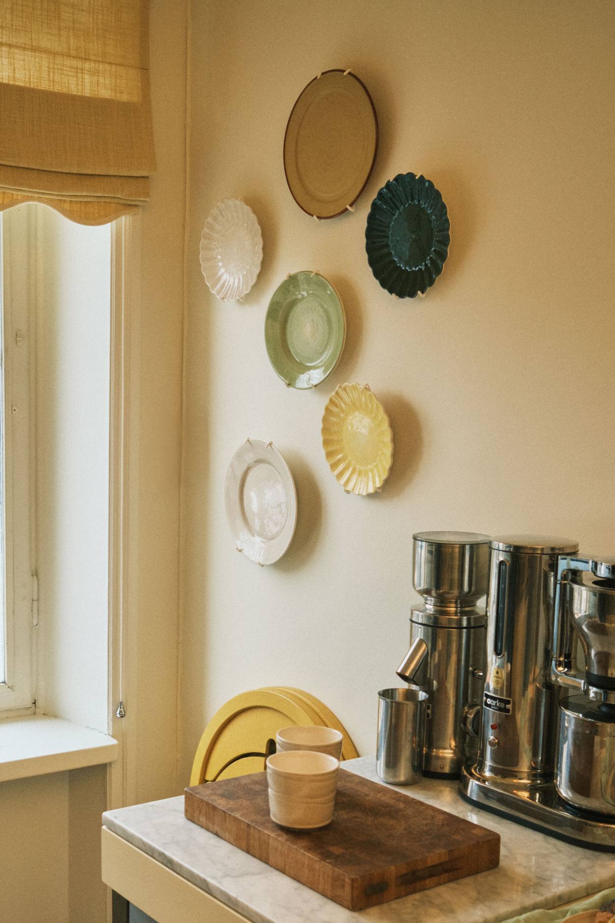 Köket som är målat i en klar gul palett, sprider både glädje och mjukhet under långsamma morgnar. Det är en varsam kontrast till Isabelles dynamiska liv inom PR-världen. Ovanför kaffestationen har Isabelle skapat en personlig tallriksvägg - en kurerad blandning av Mateus, inklusive favoriter från Oyster-kollektionen, kombinerat med noga utvalda vintagefynd. Väggens komposition känns spontan men ändå genomtänkt.