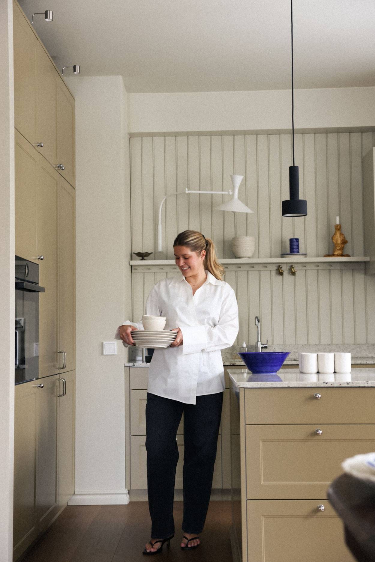 Som fotograf har Mona ett öga för komposition; ingenting känns överstylat, men allt samspelar vackert. I det harmoniska köket blir till och med spåren efter en brunch till något vackert. Tallrikarna, skålarna, muggarna och uppläggningsfaten som står prydligt på köksön berättar historien om en måltid lagad med kärlek och avnjuten tillsammans med vänner. Keramiken är inte bara vackra föremål skapade för speciella tillfällen, utan en naturlig del av vardagens rutiner.